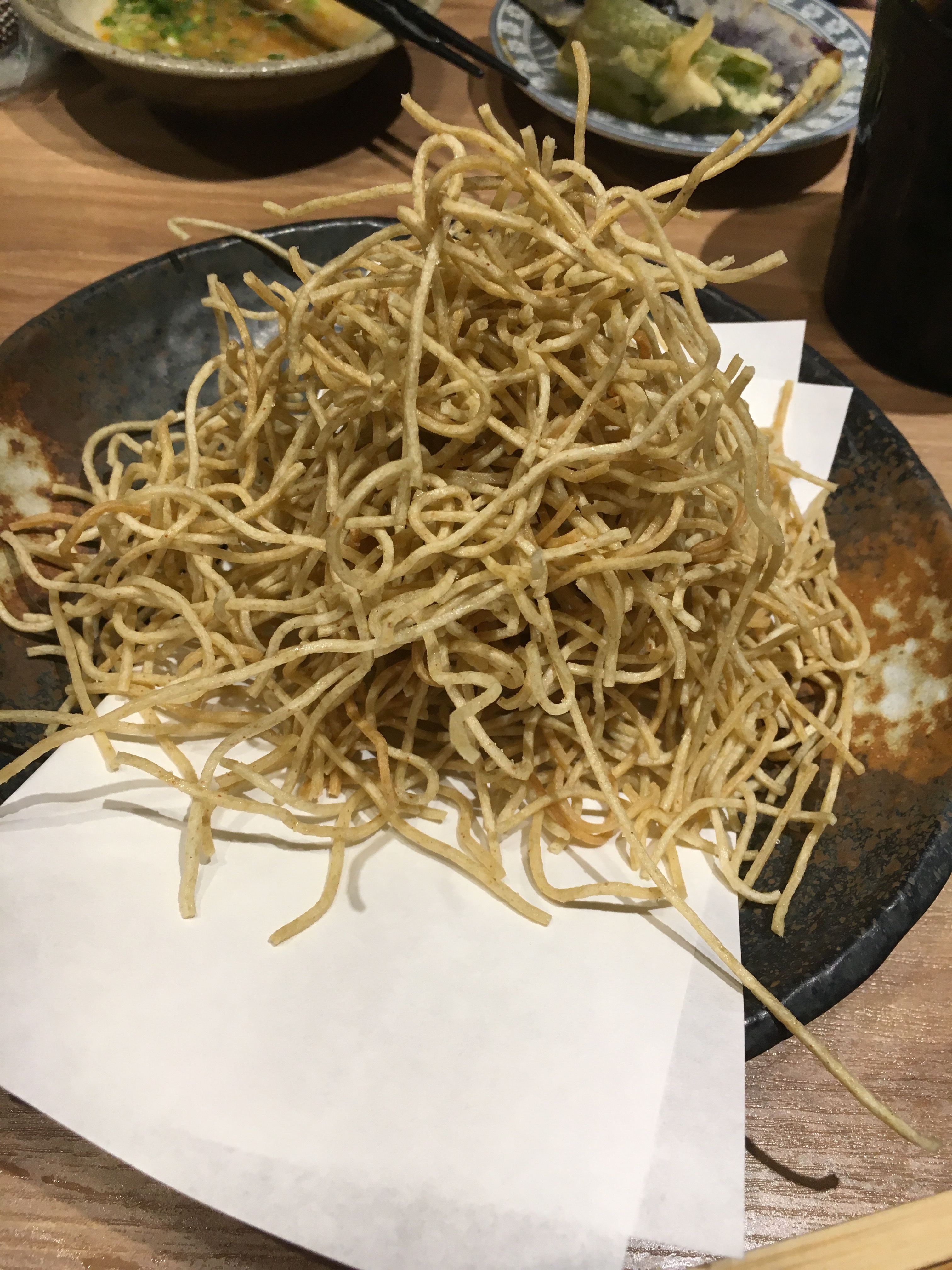カリッと上がった鶏皮にネギとぽん酢をかけてあります。
