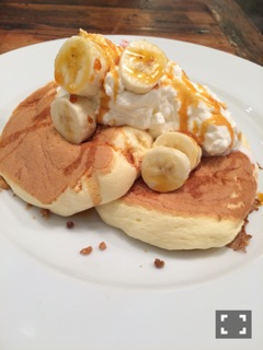ふわふわの厚めなパンケーキが3枚と、生クリーム、キャラメル、バナナのトッピングでした。